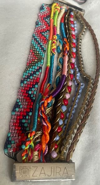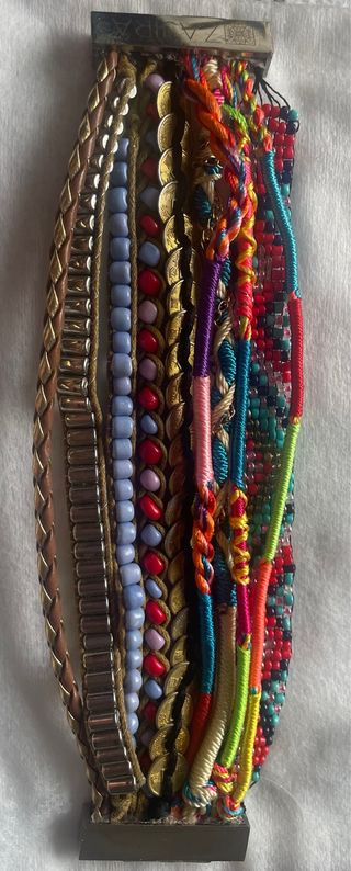 Pulsera de la marca Zajira con un diseño vibrante y lleno de detalles. - Múltiples hilos y abalorios de colores. - Elementos metálicos dorados. - Cierre magnético.