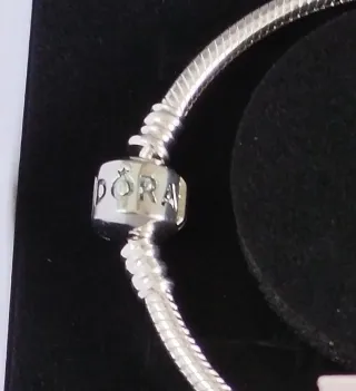 Pulsera de plata de la marca Pandora con tres abalorios. - Diseño de serpiente. - Incluye un abalorio con forma de corazón. - Incluye un abalorio con forma de cruz. - Incluye un abalorio decorativo.