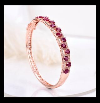 Sofisticada pulsera artesanal con 14 rubíes certificados de 0,46 ct cada uno y un acento de 120 topacios brillantes engastados sobre metal hipoalergénico acabado en oro rosa premium. La fuerza del rojo intenso y profundo de los rubies unido con el brillo y luminosidad que integran los topacios, aportan a la joya un llamativo equilibrio entre fuerza y delicadeza. Estado: Nuevo, excelente Peso: 12,36 gs Dimensiones: 63,20 x 55,35 x 7,55 mm Diametro interior: 57 mm Se adjunta certificado en el envío.