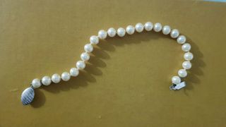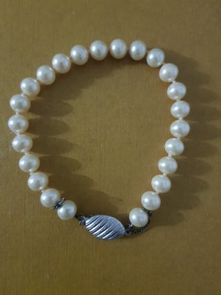 Elegante pulsera de perlas con un bonito cierre. - Perlas de color blanco nacarado. - Cierre de metal con diseño acanalado. - Perlas engarzadas con nudo.