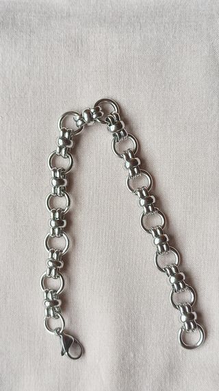 Elegante pulsera de acero inoxidable de alta calidad. Su diseño con eslabones entrelazados le da un toque moderno y sofisticado. Mide 21 CMS de largo. - Material: Acero inoxidable. - Acabado pulido brillante.