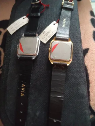 Dos relojes de pulsera de la marca Avia, uno con detalles en oro y otro en plata. - Diseño clásico y elegante. - Correas de piel. - Fabricación suiza.Son nuevos con etiqueta muy bien guardados de los anos 60 .. Precio 75€ cada uno