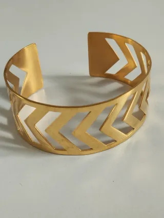 Elegante brazalete dorado con un diseño moderno y llamativo. - Acabado metálico brillante. - Patrón de flechas o zig-zag recortado. - Estilo abierto, tipo pulsera. - Diseño contemporáneo.