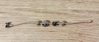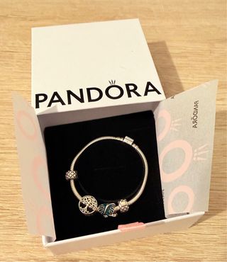 Pulsera de la marca Pandora. Lote compuesto por: - 1 pulser Pandora (16 cm -ver última foto!). - 2 charms (arbol y hoja). - 2 clips. Lote valorado en: 180€ Usado un par de veces. No es mi estilo. Entiendo que es de 16 cm aunque no llega (pienso que es así, porque está con los charms y clips).