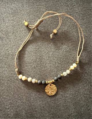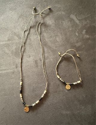 Conjunto de colgante y pulsera con cuentas y detalle de moneda. - Diseño ajustable. - Cuentas de diferentes tonos y texturas. - Colgante con acabado dorado - Unisex