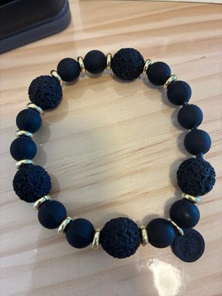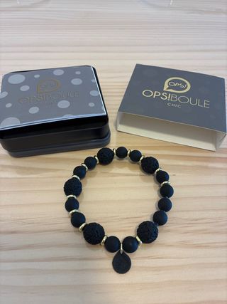Elegante pulsera de la marca OPS!BOULE con un diseño moderno. - Combina cuentas negras mate y texturizadas. - Detalles metálicos dorados. - Colgante circular con relieve.