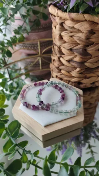 Elegante pulsera elaborada con fluorita natural. - Piedras con tonalidades verdes y púrpuras. - Tamaño 6mm