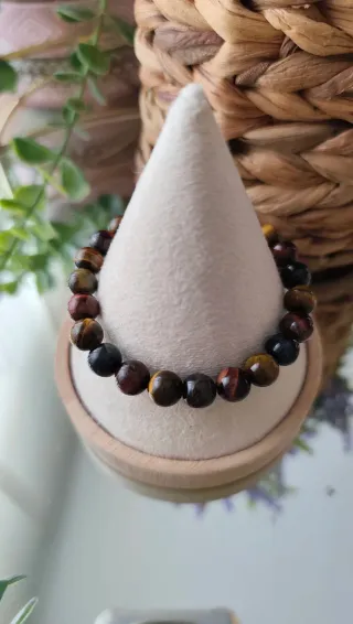 Pulsera de ojo de tigre de 8mm. Cada piedra presenta una combinación de tonos marrones, rojizos, y azulado creando un diseño natural y llamativo. - Cuentas de 8mm. - Piedra ojo de tigre.