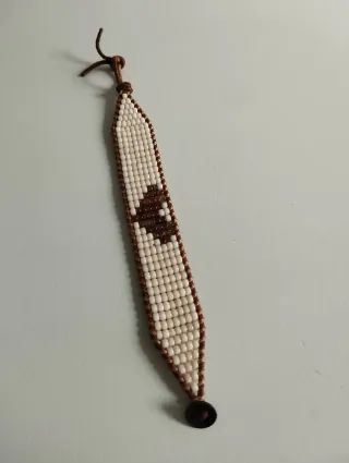 Pulsera tejida con cuentas de colores y detalle de cuero. Hecha a mano. - Diseño con patrón de rombos en marrón. - Cierre con cordón de cuero y botón.