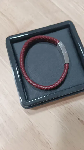 Elegante pulsera de cuero trenzado con cierre metálico. Una en azul y otra en negro. - Sin usar nunca y en su caja original. - Diseño trenzado. - Cierre de gancho. - Detalle de logo grabado. Precio por unidad