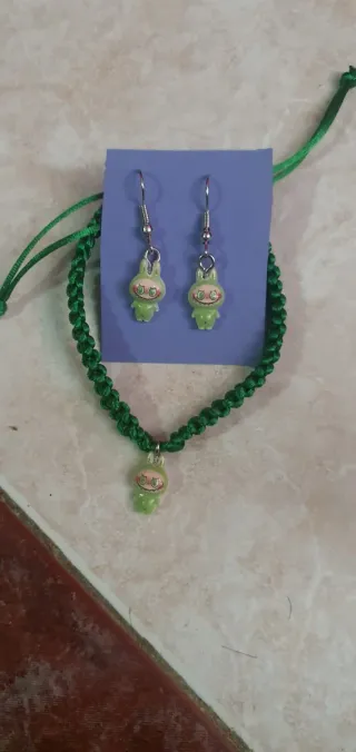 Conjunto de pulsera y pendientes con el personaje Labubu. - Diseño de personaje. - Cierre ajustable en la pulsera. Distintos colores de labubus y pulsera