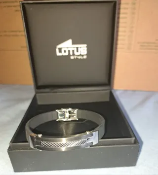 Elegante pulsera de la marca Lotus. - Diseño moderno con banda de silicona negra. - Detalle central metálico plateado con grabado. - Cierre de seguridad plateado.