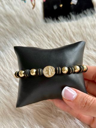 Pulsera con medalla de San Benito y cuentas. - Diseño con cuentas negras y doradas. - Medalla central de San Benito. - Fabricada en oro laminado de 18k.