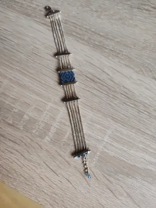 Elegante pulsera de plata con un diseño único. - Elaborada con plata. - Adornada con cuentas y detalles en color azul. - Múltiples cadenas finas.