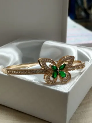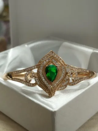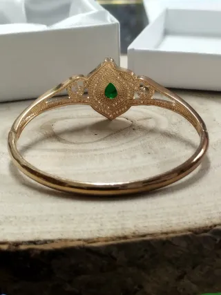 Elegante pulsera de acero con un diseño llamativo y un toque de color. Viene presentada en su caja original. - Acabado en tono dorado. - Detalle central con piedra verde. - Incrustaciones de circonitas brillantes. - cierre a presión. Medidas en las fotos - ARTÍCULO NUEVO. LIQUIDACIÓN TIENDA