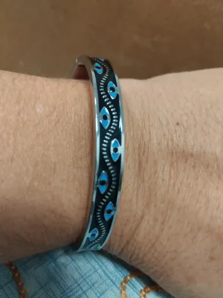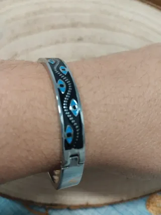 Elegante pulsera de acero esmaltado con un diseño de ojo turco. Se envía con bolsita de organza - NUEVO. LIQUIDACIÓN TIENDA SOLO QUEDA WSTA UNIDAD. Material: Acero esmaltado. - Diseño: Ojo turco.