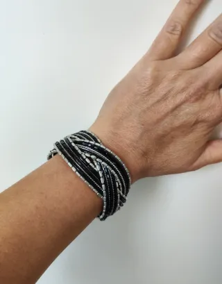 Elegante pulsera para mujer con un diseño trenzado. Combina hilos negros y detalles plateados. Se adapta a cualquier medida porqué es flexible