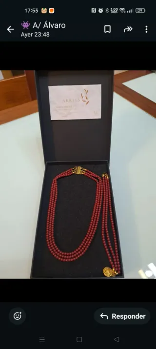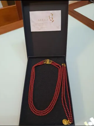 Conjunto de collar y pulsera de coral con detalles dorados. - Diseño de tres hilos para el collar. - Cierre dorado. - Colgante circular con relieve dorado.