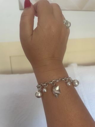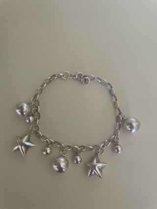 Elegante pulsera de plata , ( no es baño de plata, es plata auténtica) con un diseño encantador. - Cadena de eslabones plateados. - Adornada con colgantes de estrellas y bolas. - Cierre de mosquetón seguro.