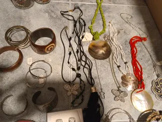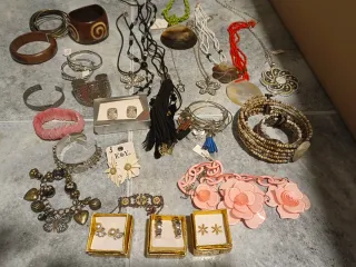 Conjunto variado de bisutería con diferentes estilos. - Variedad de pulseras, algunas con detalles de pedrería. - Collares con colgantes de conchas y mariposas. - Piezas con acabados en tonos madera y metalizados. Total 80 piezas 27 collares 33 pulseras 20 pares de pendientes Todo en muy buen estado y muchas sin usar.