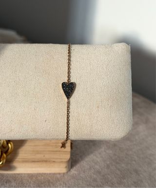 Elegante pulsera de la marca Fossil con un diseño de corazón. Acabado en tono dorado. Corazón adornado con pequeñas piedras negras. Material: acero dorado.