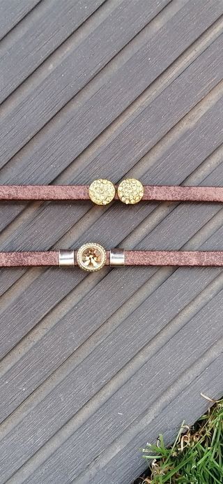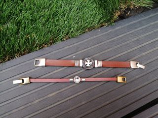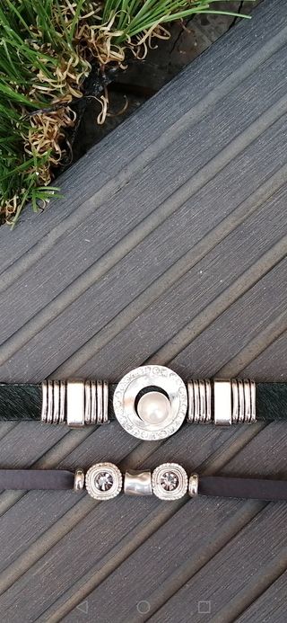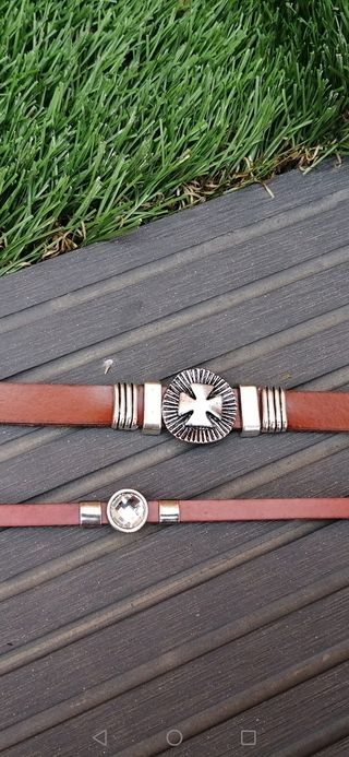 Pulseras de cuero con piezas y cierre de metal.