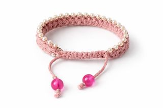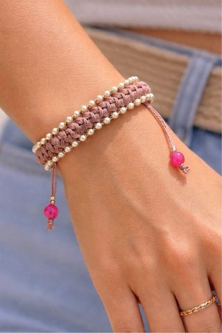 Pulsera tejida a mano con un diseño delicado y adornada con perlas. - Cierre ajustable. - Detalles de cuentas fucsia.