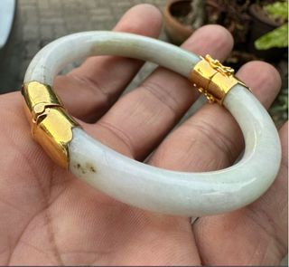 Elegante pulsera rígida de jade en tono verde claro con cierre lateral de oro. • Peso total: 36,87 g • Diámetro interior: 5,2 cm • Para muñeca aprox.: 16 cm • Piedra: jade natural • Cierre lateral de oro Pieza vintage / de segunda mano. Se vende tal como aparece en las fotos.