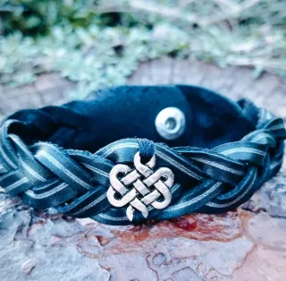 Pulsera de Piel Auténtica, Cuero Español. Trenzado de 4 cabos Adorna el Trenzado una fina línea central en color plata. Nudo Celta de metal cosido a mano sobre el Trenzado. Artesanía, Handmade, diseño propio, si te gusta pero la quieres en otro color, otra medida o con otro dije o abalorios, habla conmigo y la diseño para tí. Más modelos de pulseras en mi armario, puedes ver algunas en la última foto. Medidas: Ancho: 1'7 cms. Cierra a: 19'5 cms. Largo total: 22cms. Unisex