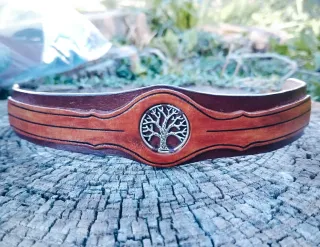 Pulsera de Piel Auténtica, Cuero Español. Parte inferior de cuero Marrón Oscuro, parte superior de la pulsera en cuero Efecto Madera con Cenefa en color Negro. Incrustado en el centro un Árbol de la Vida en metal plateado de 2cm. de diámetro, cosido a mano al cuerpo de la pulsera. Pieza Única para alguien especial. Artesanía, Handmade, Diseño Propio. Si te gusta pero la quieres en otro color, otra medida o con otro dije o abalorios, habla conmigo y la diseño para tí. Más modelos de pulseras en mi armario, puedes ver algunas en la última foto. Medidas: Ancho: 2'5 cms. Ancho centro: 3'5cms Cierra a: 21 y 22cms. Largo total: 25cm
