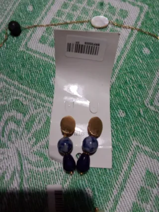 Elegante conjunto de complementos para mujer. - Collar con cadena dorada y cuentas de piedra azul. - Pulsera a juego con cuentas de piedra azul, perlas y nácar. - Pendientes colgantes con cuentas de piedra azul y detalles dorados.