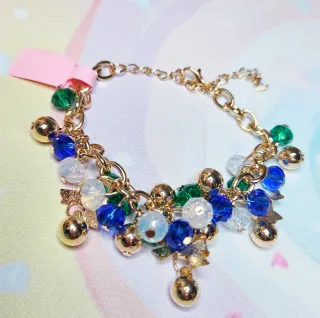 Bonita pulsera con cadena dorada y múltiples abalorios. - Abalorios de cristal en tonos azules y verdes. - Cuentas doradas. - Cierre de mosquetón.