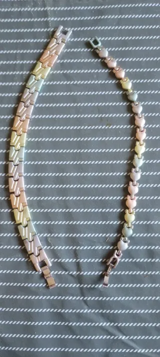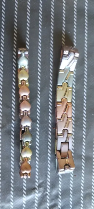 Conjunto de dos pulseras con diseños variados. - Una pulsera con eslabones en forma de corazón. - Otra pulsera con eslabones tipo bloque. - Combinación de tonos plateados, dorados y cobrizos.