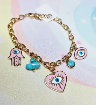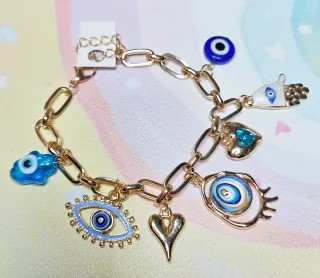 Bonita pulsera con varios dijes decorativos. - Dijes con motivos de ojos de la suerte. - Dijes con forma de corazón. - Cadena de eslabones dorados.