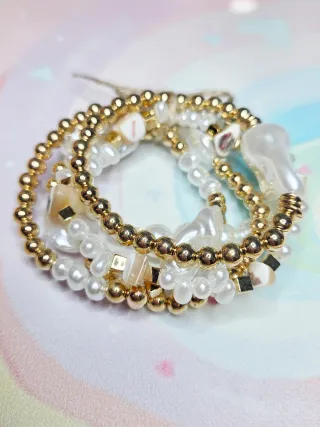 Conjunto de pulseras con un diseño elegante y moderno. - Combinación de perlas y cuentas doradas. - Detalles en forma de cubo y piezas irregulares. - Estilo delicado y llamativo.