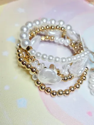 Conjunto de pulseras elásticas con un diseño elegante. - Combinación de perlas blancas y cuentas doradas. - Diseño delicado y versátil. -Cada set (5 pulseras) se venden por separado. En la imagen se muestran los diferentes sets que hay