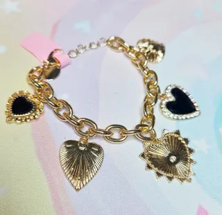 Bonita pulsera con cadena de eslabones dorados y varios charms colgantes. - Charm de corazón negro con borde dorado. - Charm de corazón negro con circonitas y borde dorado. - Charm de corazón dorado con relieve. - Charm de corazón con relieve y detalle central. - Charm floral dorado.