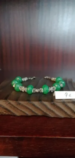 Elegante pulsera con cuentas de un vibrante color verde y detalles plateados. Un accesorio llamativo y versátil. - Diseño con cuentas facetadas. - Elementos metálicos decorativos.