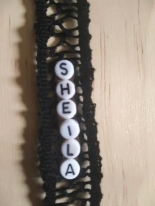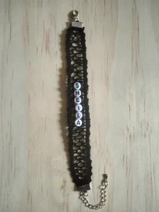 Pulsera de encaje de bolillos con el nombre SHEILA con cuentas. - Diseño de encaje negro. - Cuentas blancas con letras negras. - Cierre de mosquetón plateado.