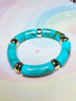 Elegante pulsera elástica con cuentas tubulares de color turquesa y detalles dorados. - Diseño tubular. - Acabado brillante.