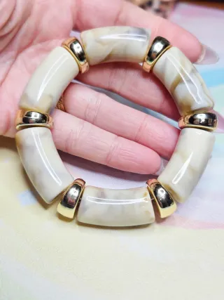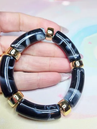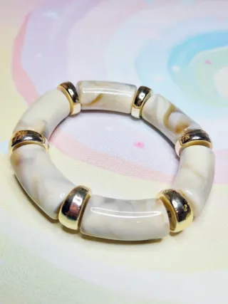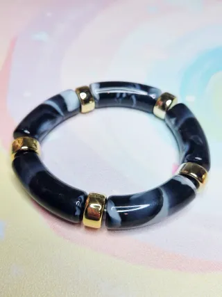 Elegante pulsera elásticas con un diseño moderno y llamativo. - Piezas tubulares con acabado marmoleado. - Detalles metálicos dorados entre las piezas.