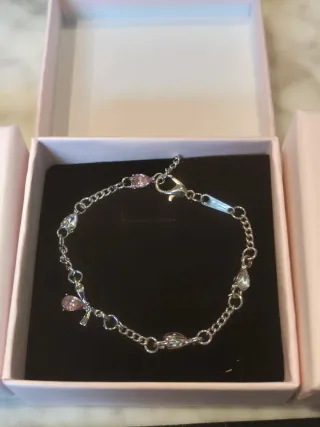 Elegante pulsera de bisutería con un diseño delicado. - Cadena plateada. - Adornos en forma de lágrima y detalles en tono rosa. - Cierre de mosquetón.