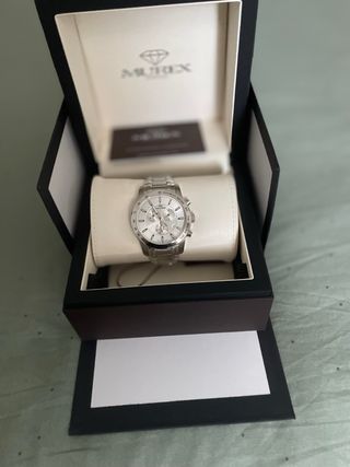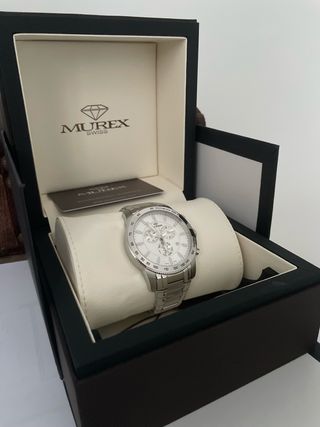 Elegante reloj Murex con detalles plateados y esfera blanca. - Diseño clásico y sofisticado. - Caja y pulsera de metal. - Esfera con múltiples subesferas.