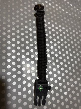 Pulsera de supervivencia con múltiples funciones integradas. Diseñada para actividades al aire libre. - Incluye brújula para orientación. - Incorpora pedernal para encender fuego. - Cuenta con silbato de emergencia.