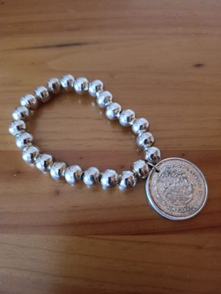 Producto 100% mexicana. Elegante pulsera con cuentas plateadas y un detalle de moneda mexicana antigua. - Diseño con cuentas esféricas. - Adorno de moneda. - Estilo moderno.