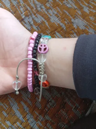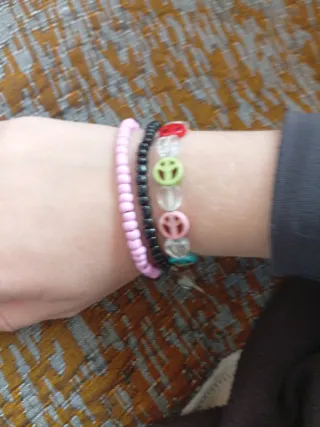 Pulsera artesanal con un diseño único que atrae buenas energías. Tal y como se ve en la foto, igual. - Elaborada con cuentas de colores variados. - Incluye dijes con el símbolo de la paz. Biene con un regalito incluido. Una pulserita negra, o rosa,amarilla o crema.