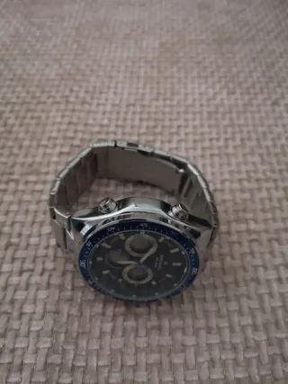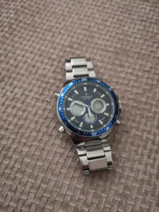 Reloj de pulsera con diseño deportivo y moderno. - Bisel azul. - Correa de eslabones plateada. - Resistente al agua WR 30M.