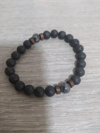 Pulsera elástica con cuentas de piedra volcánica y detalles de madera. - Diseño unisex. - Combina cuentas negras y grises. Se puede ver sin compromiso. En Villena