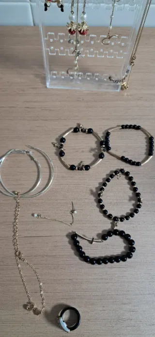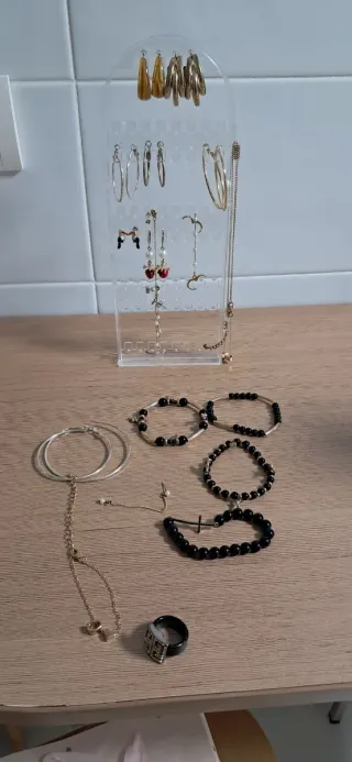 Preciosa colección de bisutería étnica. Incluye un collar y tres pulseras de madera, con tonalidades verdes y marrones. Las piezas presentan un diseño artesanal único. - Collar largo con cuentas de madera y detalles en verde y marrón oscuro. - Tres pulseras de madera, dos con diseño de piezas grandes y una con diseño de piezas más pequeñas y cilíndricas. - Ideales para añadir un toque bohemio a tu estilo.Sin estrenar.Las 4 piezas por 10€.