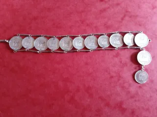 Pulsera con 13 monedas de plata vintage. Las monedas son Bolívares Venezolanos de plata del año 1960 de 25 y 50 céntimos.Mide abierta 19,4 centimetros,en perfecto estado. Entrego en bolsita de organza.